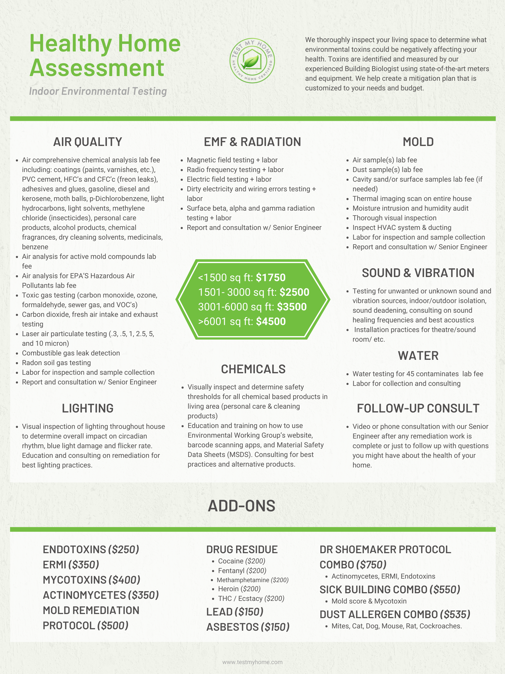 A Healthy Home Assessment consists of a thorough inspection of your living space by one of our expert Building Biologists. We assess the essential layers of environmental influences to determine what could be negatively effecting your health. Environmental influences are identified and measured using our state-of-the-art meters and equipment.